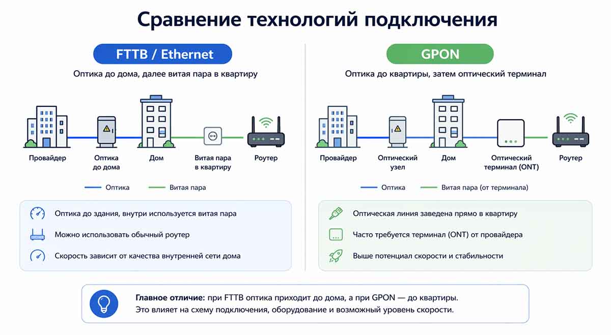 Для домашнего интернета чаще всего сравнивают как минимум две понятные пользователю схемы: GPON и FTTB. В официальных описаниях провайдеров это различие формулируется довольно просто: при FTTB оптика доходит до здания, а внутри обычно используется витая пара; при GPON оптическая линия заводится прямо в квартиру или помещение клиента. Это не означает, что GPON автоматически “лучше всегда”, но технология действительно влияет и на схему подключения, и на потолок скоростей, и на требования к оборудованию.